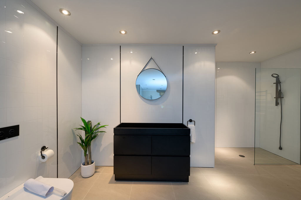 - Plywood vanity with dark oak wood grain finish (3D textured finish)